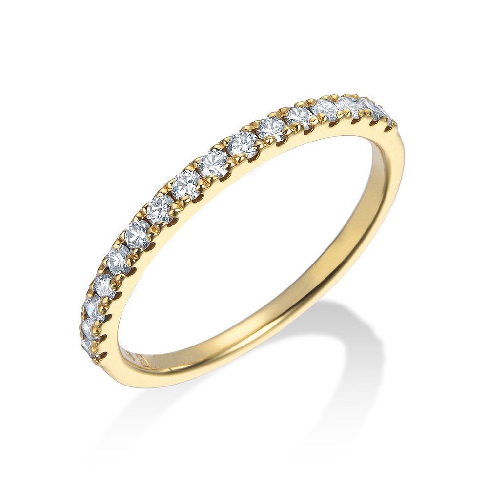 ロイヤル・アッシャーならではのダイヤモンドの白い輝きとゴールドの爪のコントラストが美しいハーフエタニティリング。細身のアームに配されたダイヤモンドの連なりが可憐な光を放ち、日常のシーンをさりげなく彩ります。